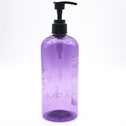 Venta al por mayor de plástico púrpura, botella de champú de 500ml, botella de loción bronceadora con bomba negra